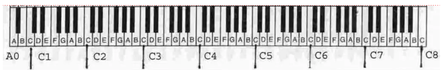 声乐中的音高按 “律” 来规范划分,比如 do re mi fa so la xi. 每一组称为一个 “八度” , 用 C1,2,3… 表示每个八度的起始”do” 音,同理 DEFGAB 表示 re mi… ; 定义中央的 C4 表示 261hz.