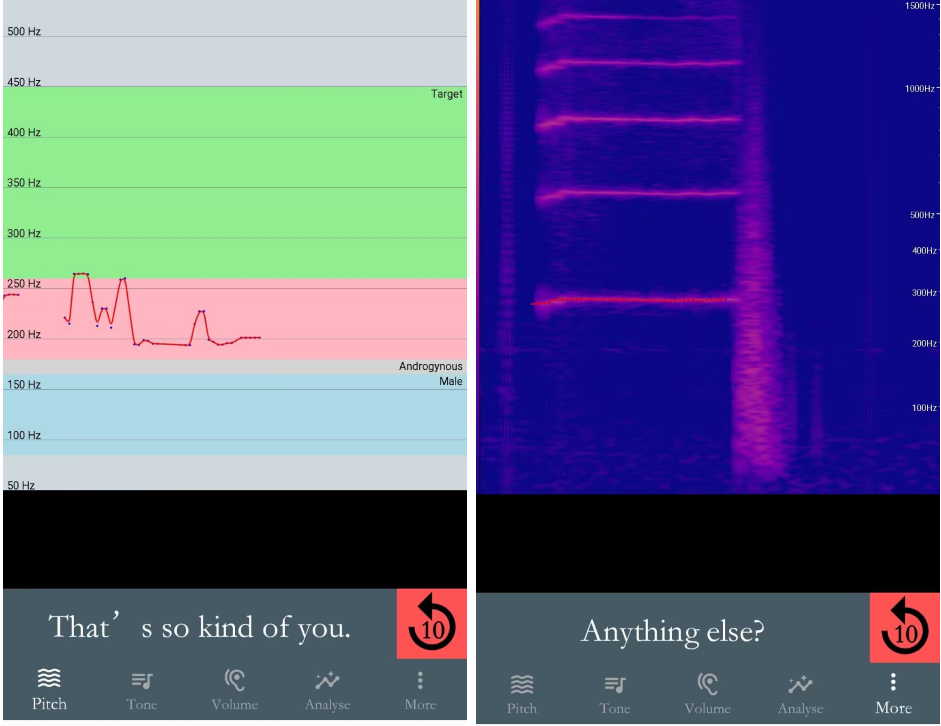 第一个显示你刚刚发音的频率,这个软件会显示男女频率的范围 (蓝粉),并且可以点击红色按钮回放刚才 10 秒内的声音